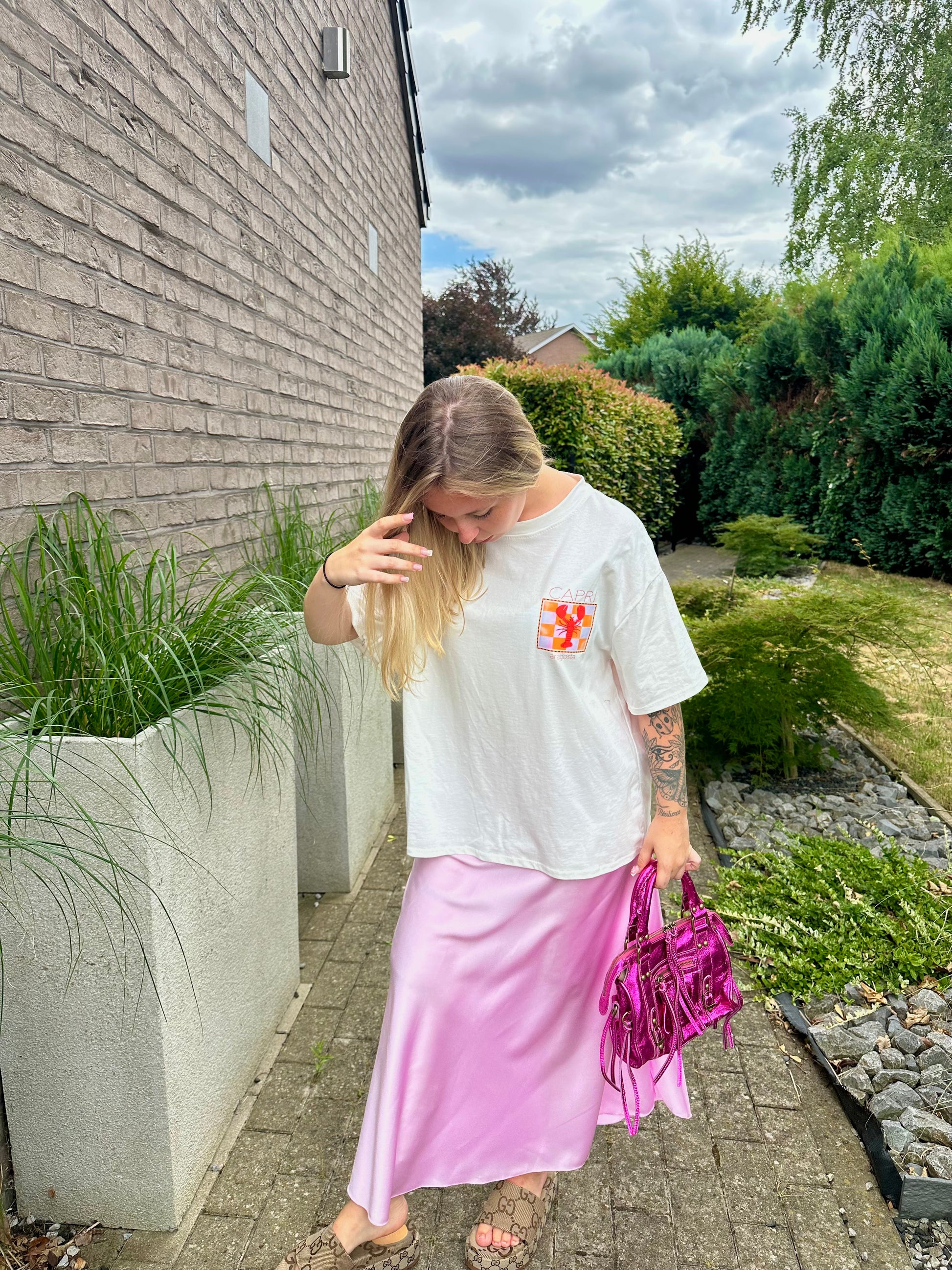 💖Je porte la jupe en satin rose claire ainsi que le petit Ciaga fushia en 100% cuir